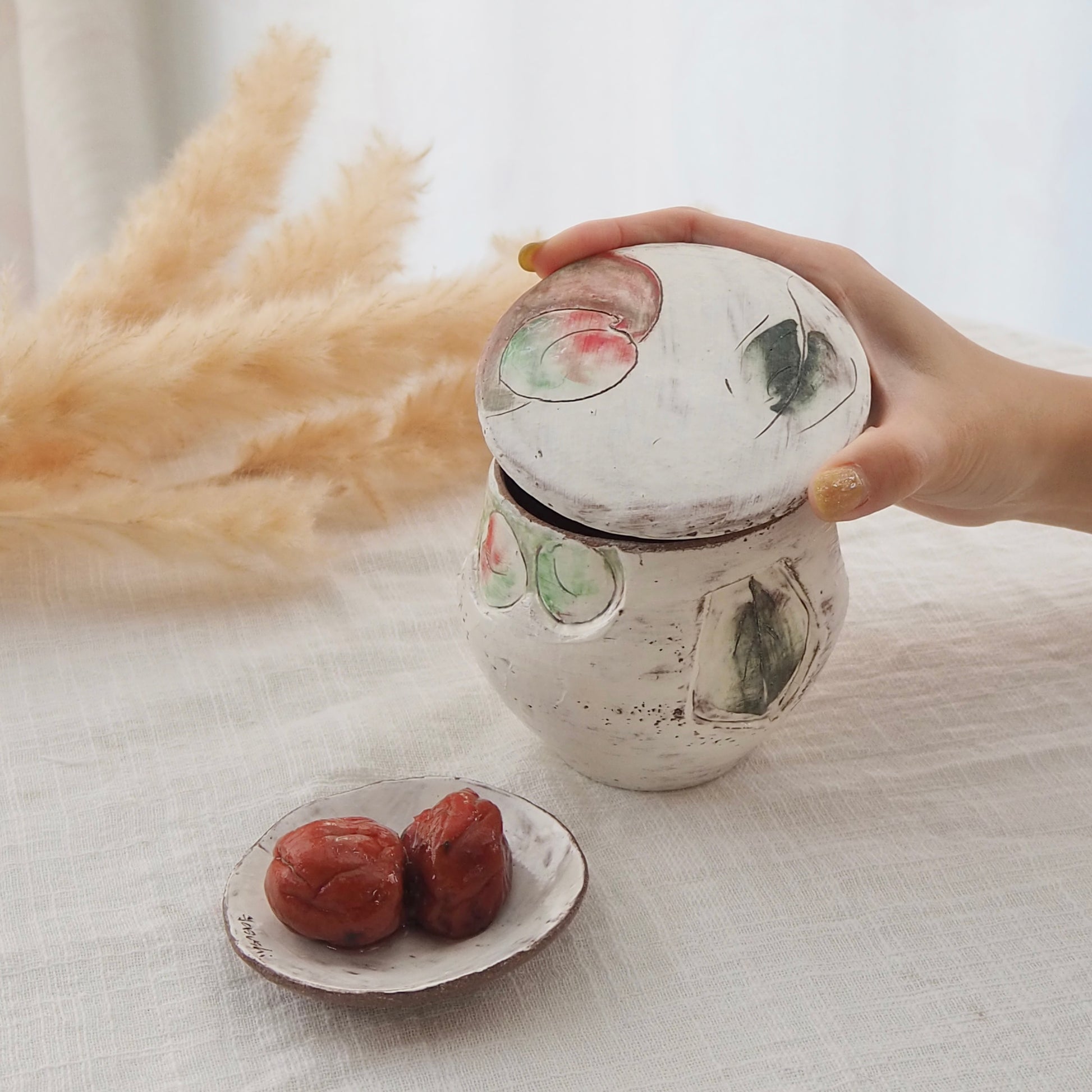大畠さんの器があまりに素敵で大好きなので、これまた、大好きな「梅干」を入れて保存できるような器を作ってほしい!と大畠さんに無理やりお願いして作ってもらった「梅干しポット」シリーズです。絵柄や形は大畠さんのセンスにお任せして、できた器はやっぱり素敵!