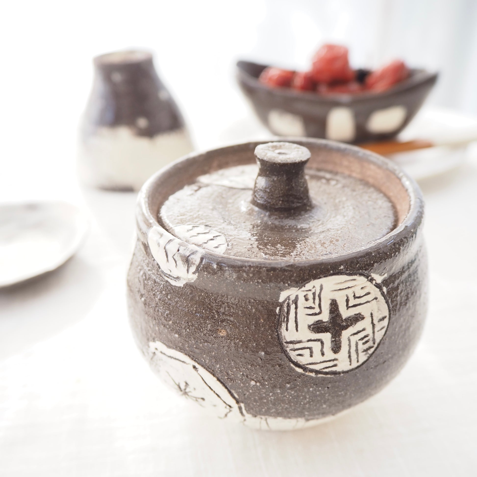 大畠さんの器があまりに素敵で大好きなので、これまた、大好きな「梅干」を入れて保存できるような器を作ってほしい!と大畠さんに無理やりお願いして作ってもらった「梅干しポット」シリーズです。絵柄や形は大畠さんのセンスにお任せして、できた器はやっぱり素敵!