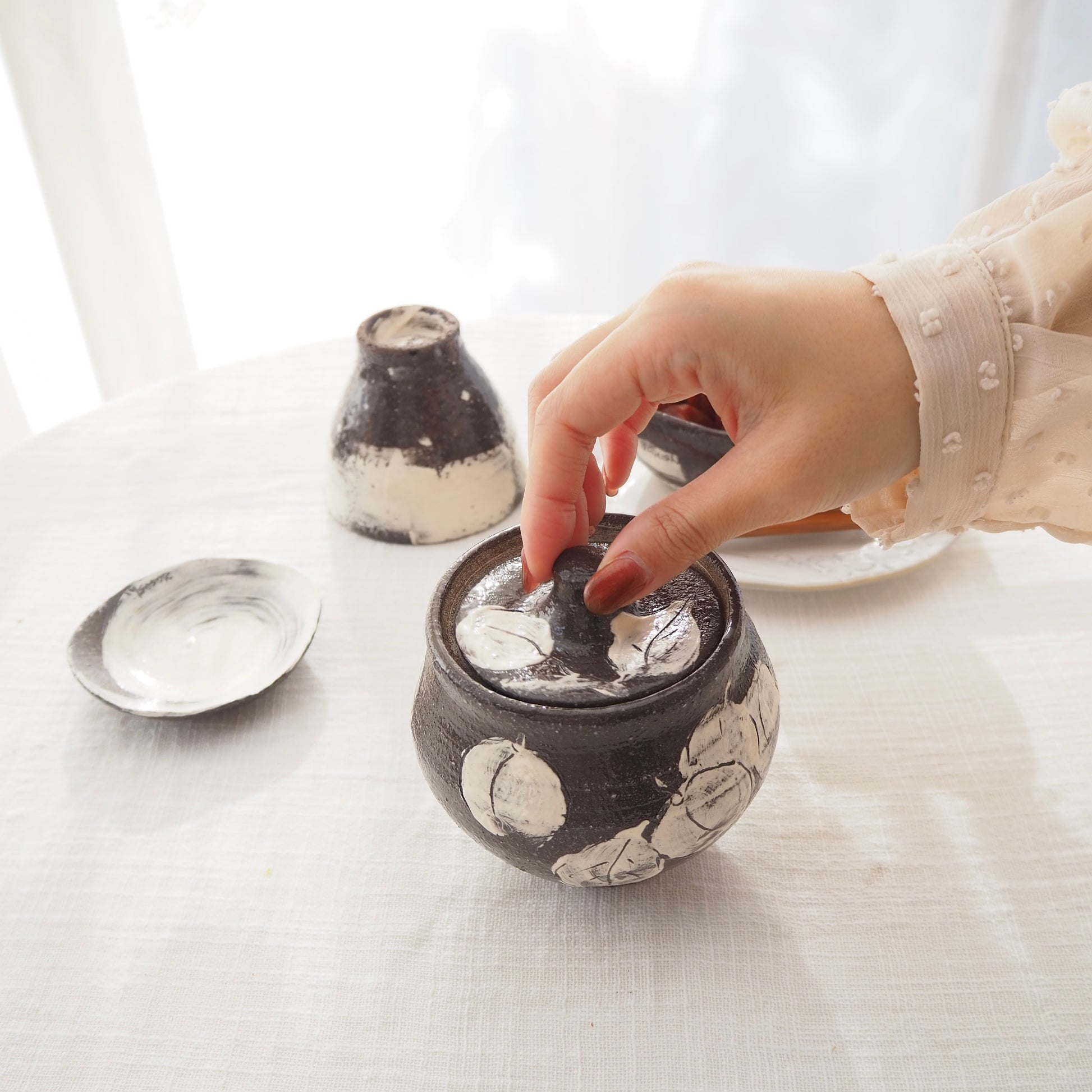 大畠さんの器があまりに素敵で大好きなので、これまた、大好きな「梅干」を入れて保存できるような器を作ってほしい!と大畠さんに無理やりお願いして作ってもらった「梅干しポット」シリーズです。絵柄や形は大畠さんのセンスにお任せして、できた器はやっぱり素敵!