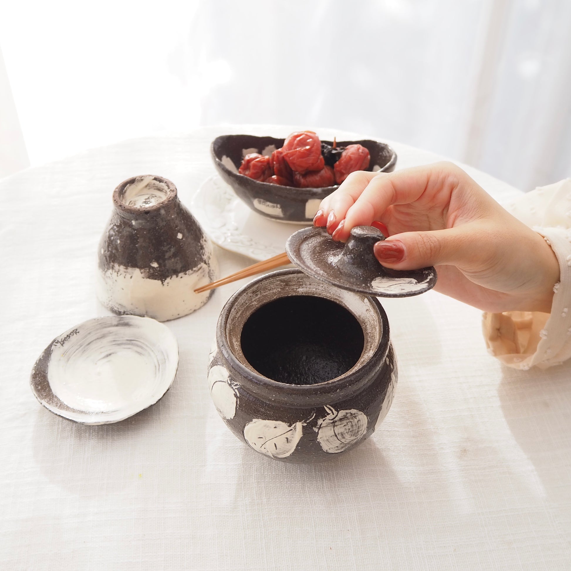 大畠さんの器があまりに素敵で大好きなので、これまた、大好きな「梅干」を入れて保存できるような器を作ってほしい!と大畠さんに無理やりお願いして作ってもらった「梅干しポット」シリーズです。絵柄や形は大畠さんのセンスにお任せして、できた器はやっぱり素敵!