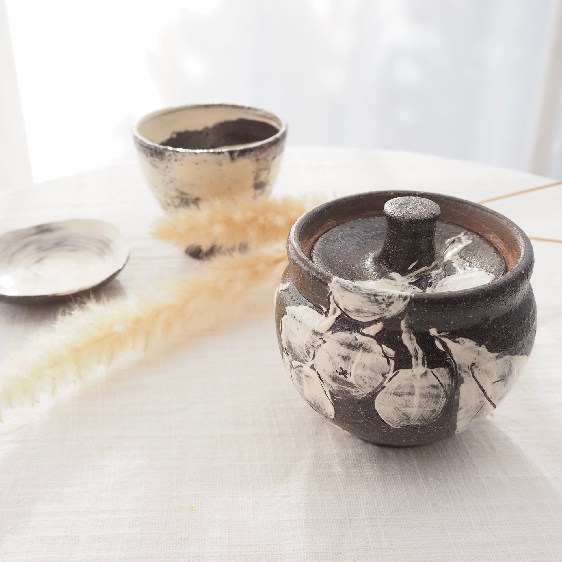 大畠さんの器があまりに素敵で大好きなので、これまた、大好きな「梅干」を入れて保存できるような器を作ってほしい!と大畠さんに無理やりお願いして作ってもらった「梅干しポット」シリーズです。絵柄や形は大畠さんのセンスにお任せして、できた器はやっぱり素敵!